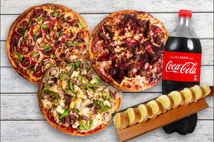 Any 3 LARGE PIZZAS, 1.25 Lt DRINK & 1 GARLIC BREAD